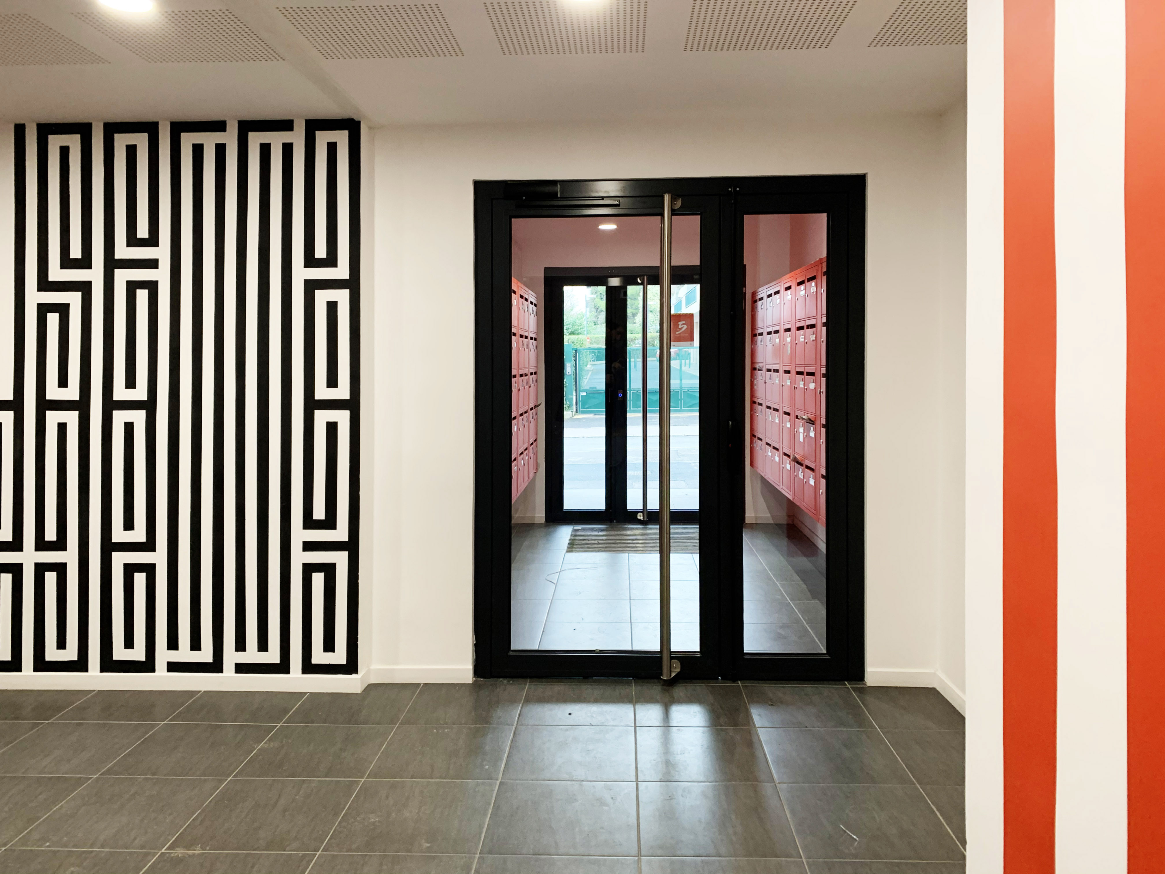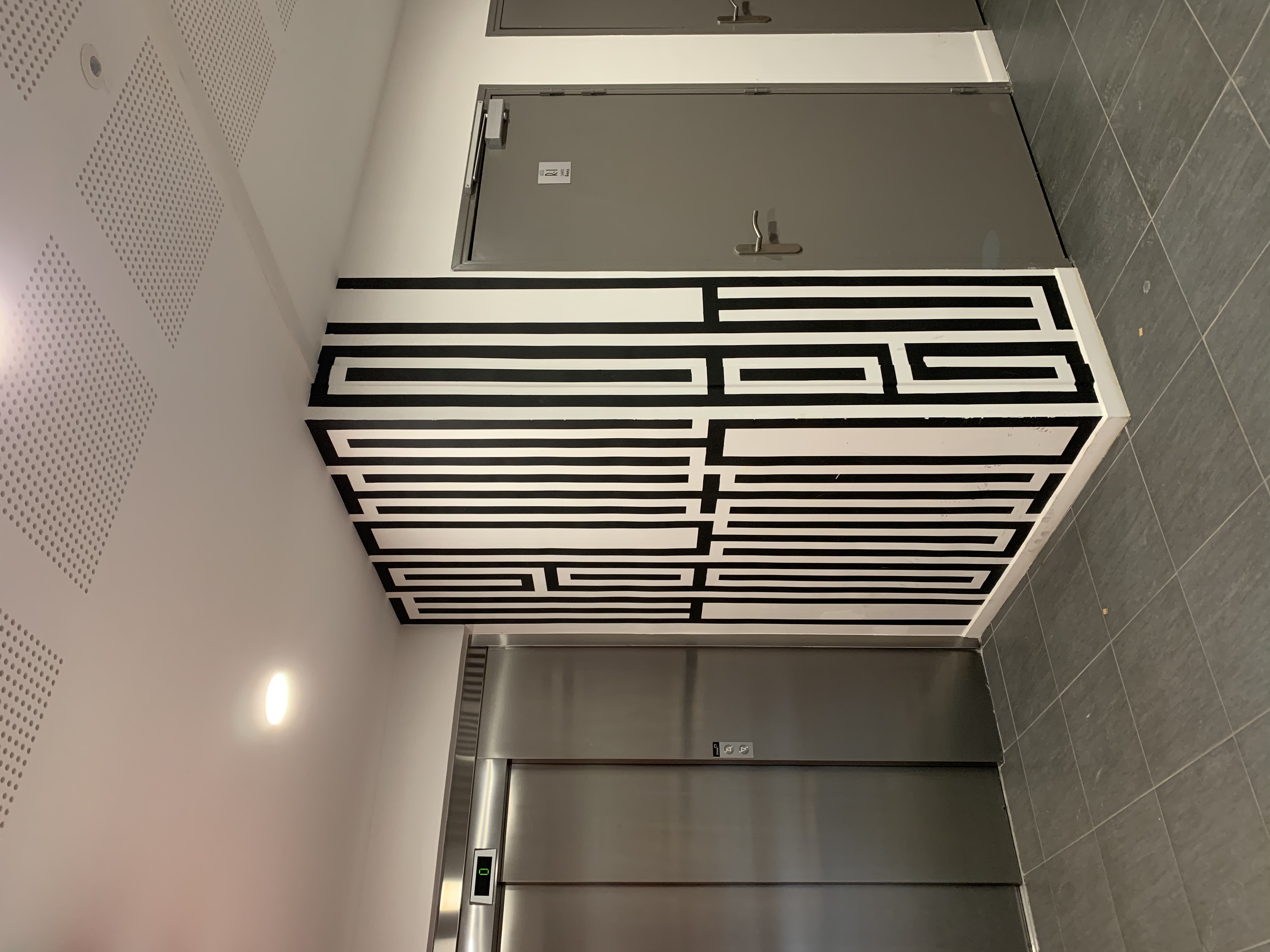 Peinture murale réalisée en Mars 2020 dans la résidence universitaire Campus Emma à Montpellier pour Real Promotion. Le mobilier : portes, sol, boîtes aux lettres, téléphone à également était choisi pour être en harmonie avec la peinture. Sur le grand mur attenant à la porte, il est écrit “Campus Emma” en Manitou.
