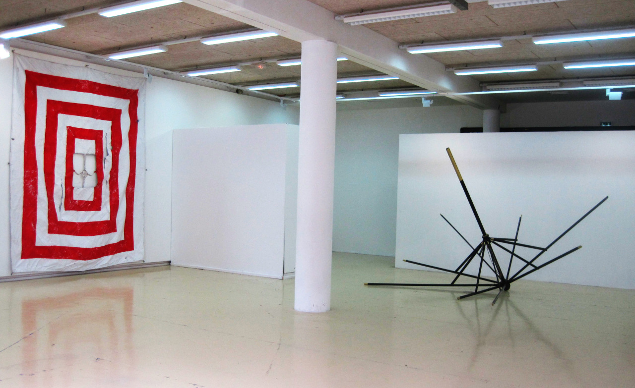 Emergency, acrylique rouge signal et blanc sur toile de parasol, 400x280cm, 2017